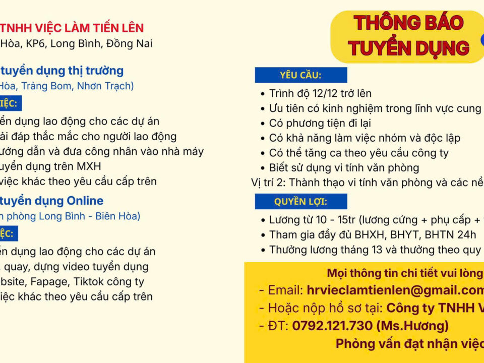 Lời đầu tiên Công Ty TNHH VIỆC LÀM TIẾN LÊN xin chào và kính chúc Quý công ty, Quý khách hàng phồn vinh và gặt hái được nhiều thành công trong lĩnh vực sản xuất kinh doanh.