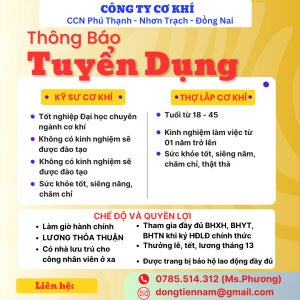 TUYỂN DỤNG TẠI CCN PHÚ THẠNH – VĨNH THANH – NHƠN TRẠCH – ĐỒNG NAI